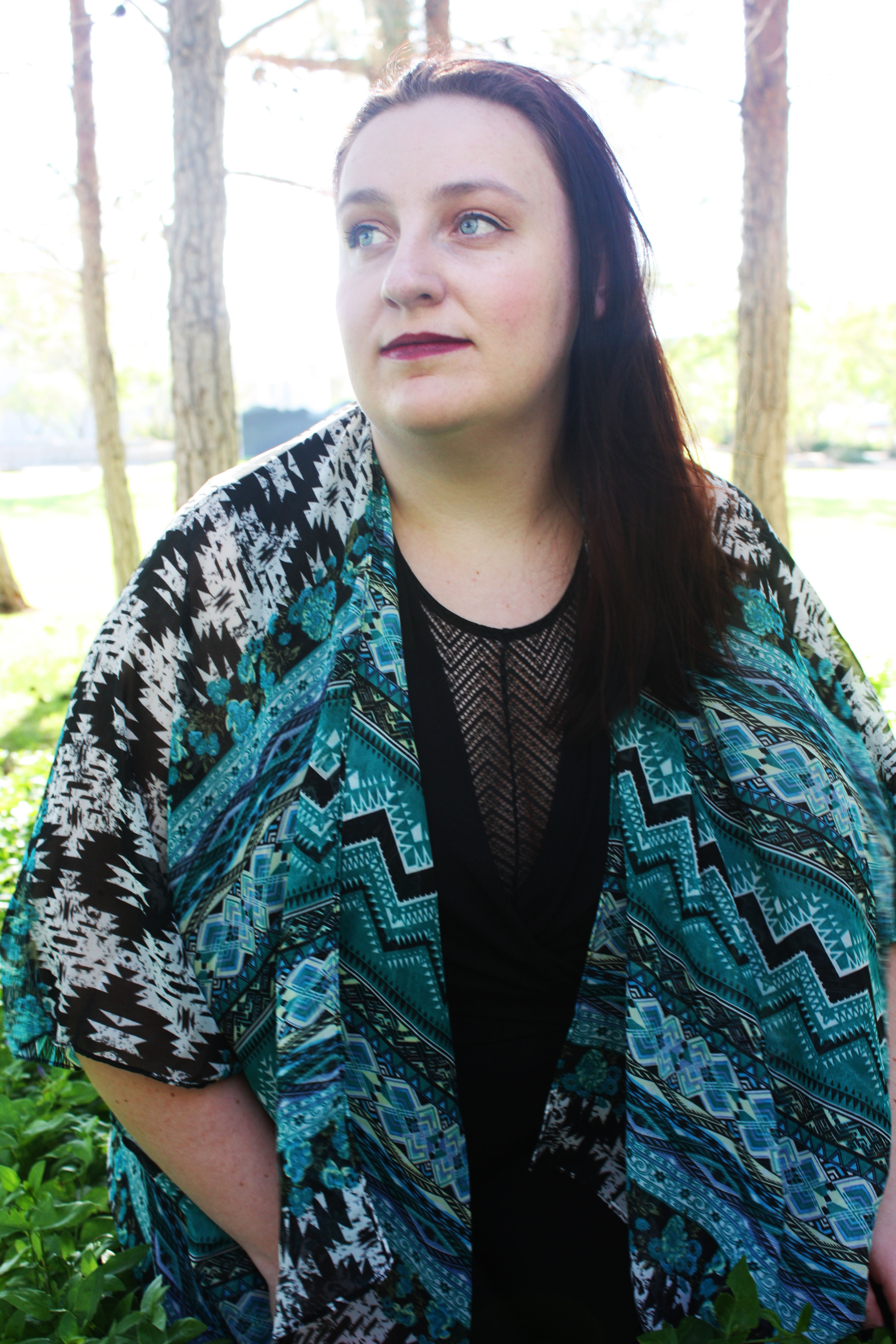 The third is a kimono/shawl of some type like I’m wearing in the photos. I stand firm in the belief that adding a kimono/shawl to an outfit makes it 20% more presentable. Plus they add color and fun patterns and such. A cardigan also works when it is colder weather.