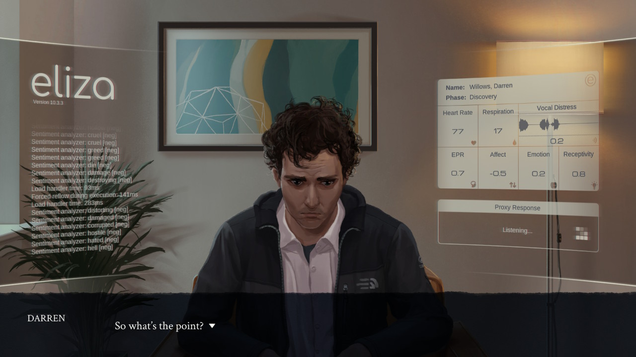 In Eliza, you play as Evelyn who becomes a proxy for the AI mental health service Eliza after spending three years away from the world. She was actually one of the original engineers on the project, so her return to the program as a proxy leads to some interesting opportunities and people. Evelyn’s main desire is to figure out where she wants her life to go after tragedy, and we as the player help steer that ship.